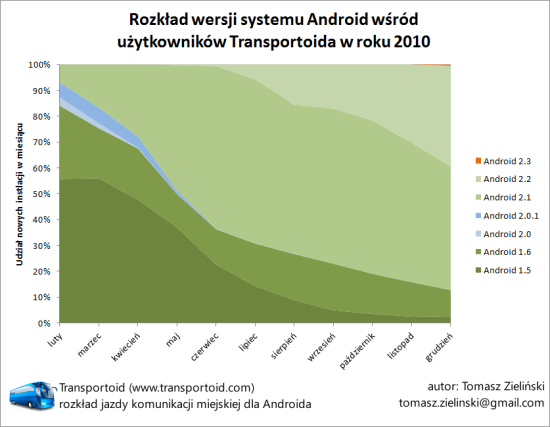 Dzięki uprzejmości Tomasza Zielińskiego, autora Transportoida (o którym pisałem w kwietniu i do dzisiaj regularnie używam), możemy zobaczyć jak prezentuje się rozkład wersji Androida wśród polskich użytkowników.