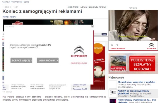W zeszłym tygodniu IAB Polska opublikowała dokument „Standard reklamy display” zawierający nowe zalecenia odnośnie formatów reklam bannerowych („display”). Dzisiaj link do artykułu na ten temat znalazł się na stronie głównej Gazety. Jednym z zaleceń jest uruchamianie dźwięku w reklamie dopiero po akcji użytkownika (w końcu! Może skończą się takie durne reklamy), więc tekst zatytułowano „Koniec z samogrającymi reklamami” i zilustrowano m.in. top-layerem Citroëna.