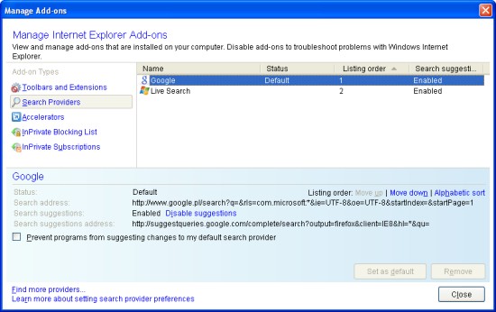 Pole wyszukiwarek obsługuje funkcje sugestii proponowane przez Google (Google Suggest) czy Live.com. Usługę można oczywiście wyłączyć. Wyświetla również strony z historii przeglądarki, które mogą pasować do wpisywanego zapytania. Wszystko konfigurowalne, instalator na siłę nie próbował ustawić Live.com jako domyślnego silnika. Wszystkim można zarządzać z panelu dodatków. Wszystko działa całkiem sprawnie.