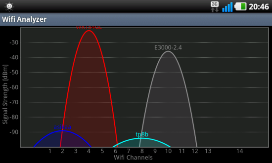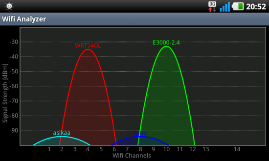 Porównałem E3000 z poprzednim routerkiem, który miał dwie zewnętrzne anteny. Jak widać po wykresach z aplikacji WiFi Analyzer, różnica nie jest bardzo widoczna… a stojąc przy samym routerze, WRT54G wypadł nawet lepiej.