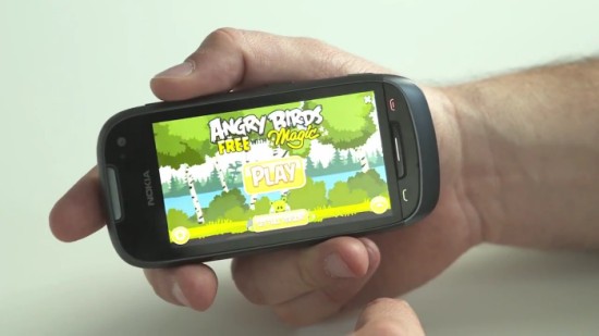 Przejrzałem sobie kilka filmików promocyjnych i reklam Nokii i na wielu z nich było widać właśnie Angry Birds. Jeśli nie krótką scenkę z uruchomioną grą, to przynajmniej ikonka gry widoczna na jednym z pulpitów.