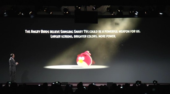 Ale wściekłe ptaki wyszły również poza komórki i tablety. Podczas tegorocznych targów CES, Samsung pokazywał swoje nowe modele telewizorów z serii Smart TV. Skoro w nowoczesnych telewizorach mamy dwurdzeniowe procesory, przeglądarki internetowe i różne aplikacje, to na pewno znajdzie się też miejsce dla Angry Birds. I tak oto podczas wystąpienia na scenie pojawił się znajomy ptak…