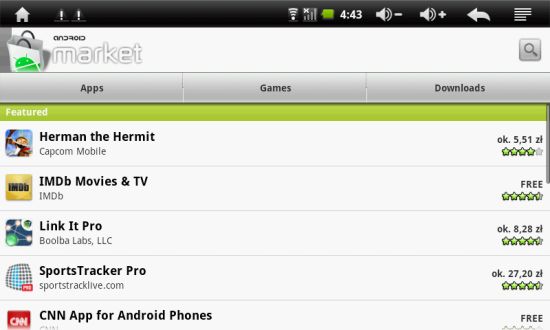 Pomijając problem z załadowaniem tła w aplikacji Marketu – http://tomasz.topa.pl/manta-mid001-tani-tablet-z-androidem-warto.html/manta-mid001-android-market – wszystko działa. Market, YouTube, Mapy i GMail są od razu zainstalowane, nie trzeba kombinować.