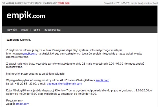 „Z przykrością informujemy, że w dniu 23 maja nastąpił błąd systemu informatycznego w sklepie internetowym empik.com, na skutek którego ceny zakupionych towarów zostały niezgodnie z naszą wolą i wiedzą znacznie zaniżone.