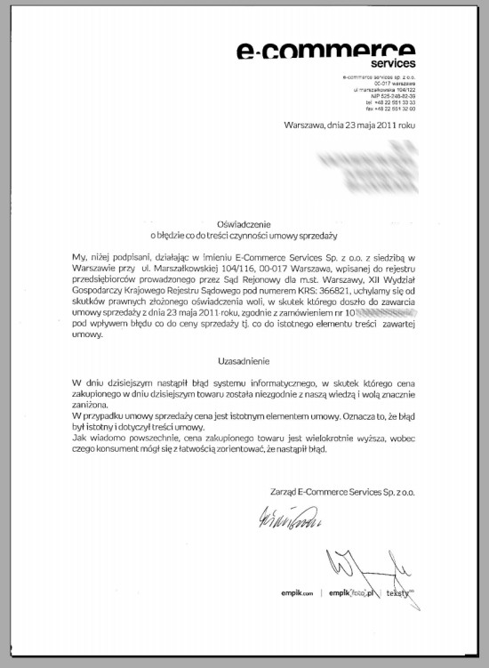 - Skan oświadczenia przesłanego przez Empik listem poleconym