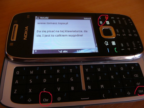 Jedyną niedogodnością jest ten nieszczęsny klawisz Chr służący do wstawania „polskich ogonków”. Jest on umieszczony na lewo od spacji, co przez kilka pierwszych dni powodowało u mnie niewyobrażalne rozdrażnienie. Chciałem wpisywać polskie znaki, a tu mi pod prawym kciukiem Alt-a brakuje. Teraz już piszę całkiem sprawnie, potrafię wpisać „ć” jednym kciukiem, a „ę”, „ą”, „ż” czy „ź” też już nie sprawiają takich problemów – prawy kciuk płynnie sięga na lewą część klawiatury. O wiele lepiej byłoby, gdyby Chr zamienił się miejscami z CTRL, ale trzeba pamiętać, że to układ klawiszy przygotowany dla całego świata, a nie tylko dla Polski.