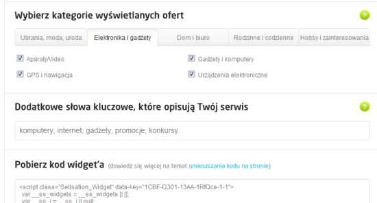 Zadaniem Sellsation.pl jest tu zebranie wszystkich ofert, posegregowanie ich w odpowiednie kategorie i wyświetlenie na właściwych stronach partnerskich. W serwisie widzę zapewnienia o geolokalizacyjnym i tematycznym dopasowaniu ofert do odwiedzających daną witrynę. Wystarczy wkleić kawałek kodu i tyle.