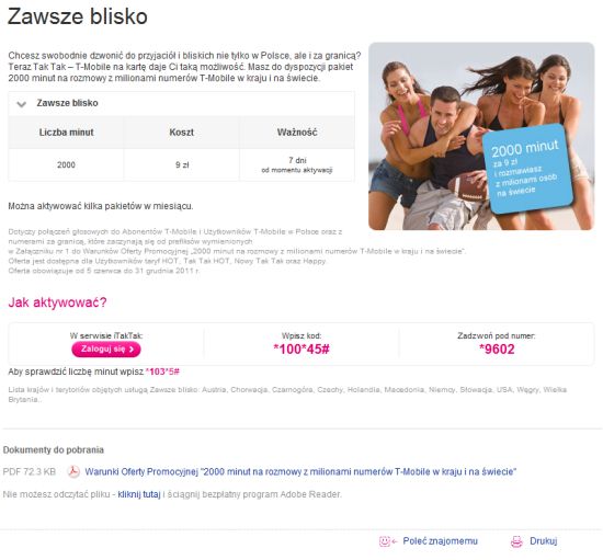 Promocyjna Usługa „Zawsze blisko” obejmuje – w ramach opłaty, o której mowa w punkcie 3 poniżej – 2000 minut do Abonentów T-Mobile oraz Użytkowników Tak Tak – T-Mobile na kartę oraz rozmów na numery T-Mobile na świecie (w Austrii, Chorwacji, Czarnogórze, Czechach, Holadnii, Macedonii, Niemczech, Słowacji, USA, na Węgrzech, w Wielkiej Brytanii), które zaczynają się od prefiksów wymienionych w Załączniku nr 1 do Warunków. Usługa „Zawsze blisko” nie obejmuje następujących połączeń: połączeń realizowanych w Roamingu, transmisji danych, połączeń wideo, oraz połączeń na numery: *9602, *9797, *9898, 602 913, 602 990, 608 908, 602 950 000, 602 951 000, 602 960 200, 602 985, 604 01 01 01, 604 02 02 02, numery Poczty głosowej, numery alarmowe, usługowe i specjalne, Numery Premium.