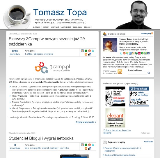 Jakoś odruchowo szukałem tam sekcji z reklamami AdTaily, ale na całe szczęście nie doszukałem się. Jedno, co bym zmienił to opis bloga (ten pod logiem „Tomasz Topa”) na zwykłe, nie drukowane litery.