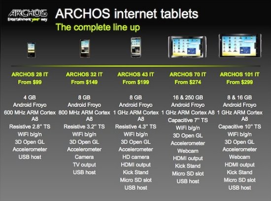 Mniejsze modele nie mają niestety ekranów pojemnościowych, zrezygnowano również z dużych mechanicznych dysków twardych na rzecz pamięci Flash. Wyjątkiem jest Archos 70 Internet Tablet, który ma być sprzedawany w opcji z dyskiem 250GB.