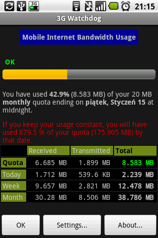 Na bieżąco mamy w pasku powiadomień małą ikonkę symbolizującą stan wykorzystania transferu – przykład widać choćby na screenie w poście o WiFi Analyzer – 3G i kolorowy pasek, który przechodzi od zielonego, przez pomarańcz, aż do czerwonego gdy zbliżamy się do limitu.