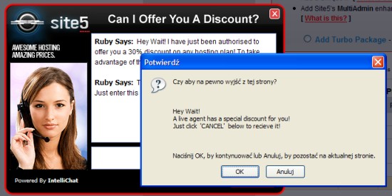 Klient chodzi po naszym sklepie internetowym, coś sobie wybrał, jest już o krok od realizacji zamówienia… i nagle chce zamknąć stronę, zrezygnować z zakupów. Co można z tym zrobić? Pozwolić mu tak łatwo wyjść? A może jednak warto go jeszcze chwilę zatrzymać i czymś zachęcić do pozostania i zrealizowania zakupów, np. rabatem? Takie rozwiązanie wprowadziła niedawno firma Site5 u których hostuję ten blog.