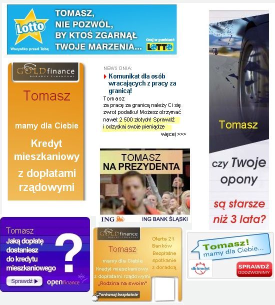 Przez ostatnie dwa dni poklikałem sobie trochę po Naszej-Klasie i byłem mocno zaskoczony liczbą reklam stosujących „myk z imieniem”. Moje imię było dosłownie wszędzie, nierzadko i w dwóch kreacjach naraz.